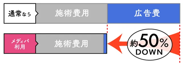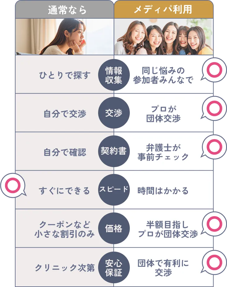 メディパは、みんなで選んだクリニックへの交渉の代行と不当な契約はないかの契約書チェックに特化しており、